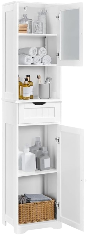 VASAGLE propose un modèle soigné, avec plusieurs étagères intérieures réglables et une porte miroir bien finie. Le design est neutre et s’intègre dans la plupart des intérieurs, du plus simple au plus moderne.